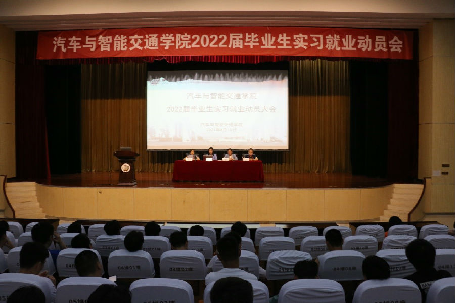 2021年6月10日,汽车与智能交通学院在图书馆多功能报告厅召开2022届毕业生实习就业动员会。党总支书记姜晓燕、院长何宇漾、副书记孙静、副院长袁红军、教研室主任、2019级辅导员、班主任和全体学生参加了本次动员会。会议由副书记孙静主持。