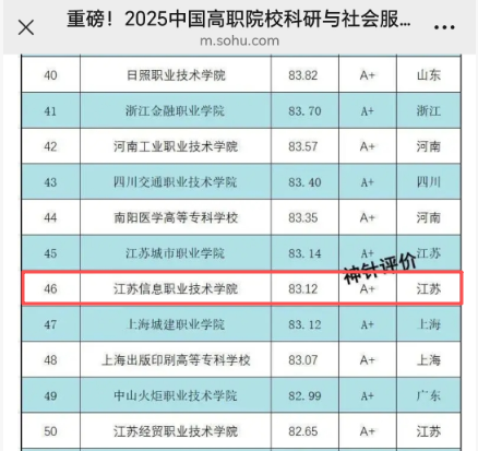 近日,神针评价(SZPJ)发布《2025中国高职院校科研与社会服务竞争力排名》,我校在1002所公办高职院校中位列全国第46位(居于A+层级)。与2024年相比,全国排名上升了37位。