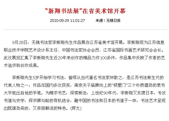 无锡日报:“新翔书法展”在省美术馆开幕
