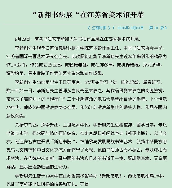 江南时报:“新翔书法展“在江苏省美术馆开幕
