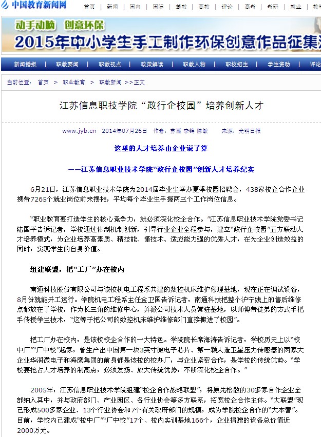中国教育新闻网:江苏信息职技学院“政行企校园”培养创新人才