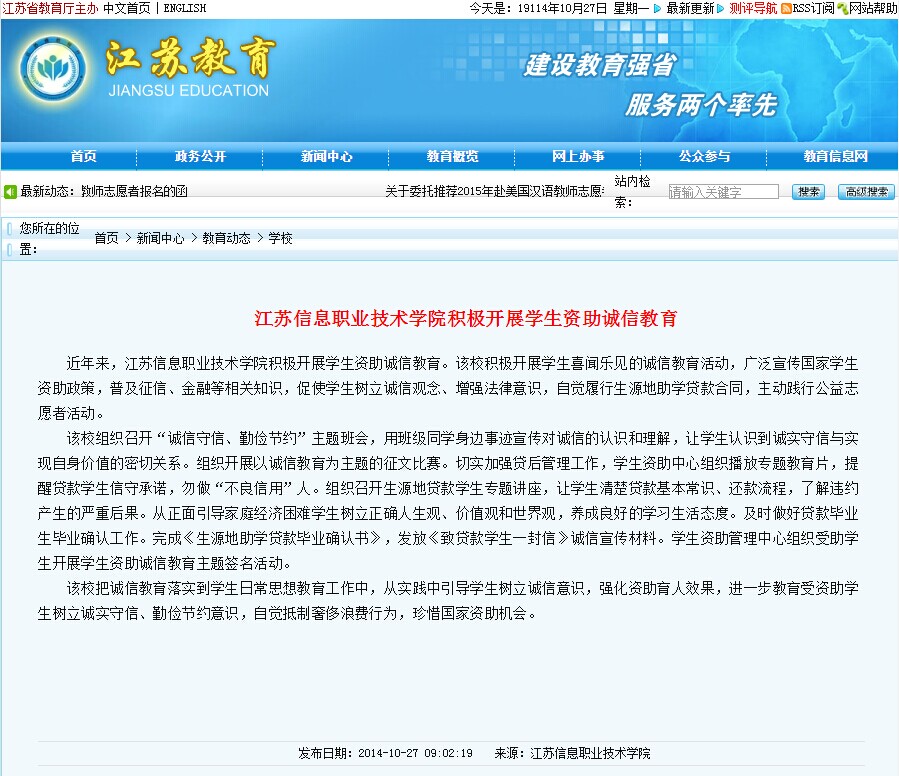 江苏教育网:江苏信息职业技术学院积极开展学生资助诚信教育