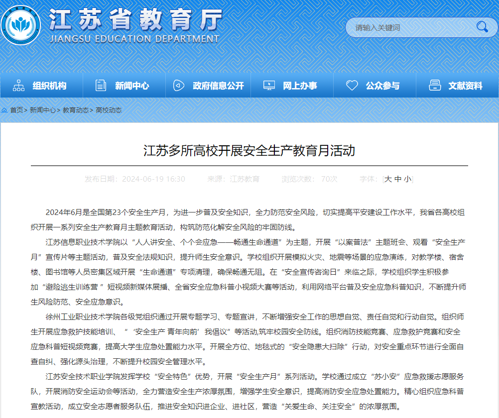 江苏教育网:江苏多所高校开展安全生产教育月活动