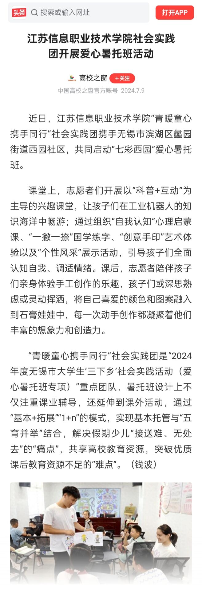 今日头条:江苏信息职业技术学院社会实践团开展爱心暑托班活动