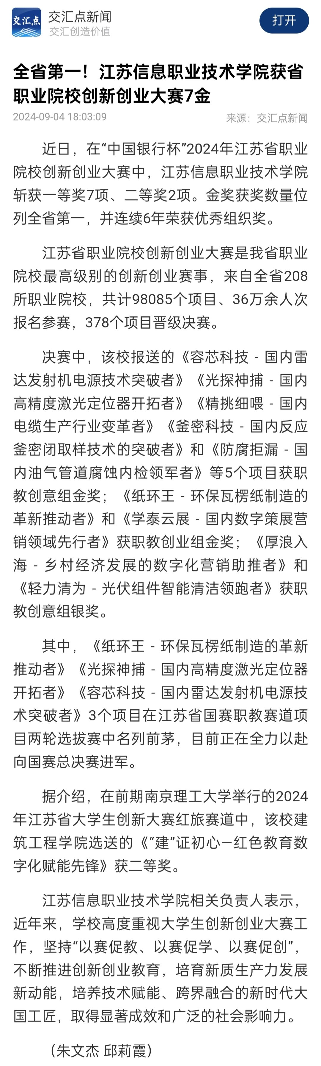 交汇点:全省第一!江苏信息职业技术学院获省职业院校创新创业大赛7金