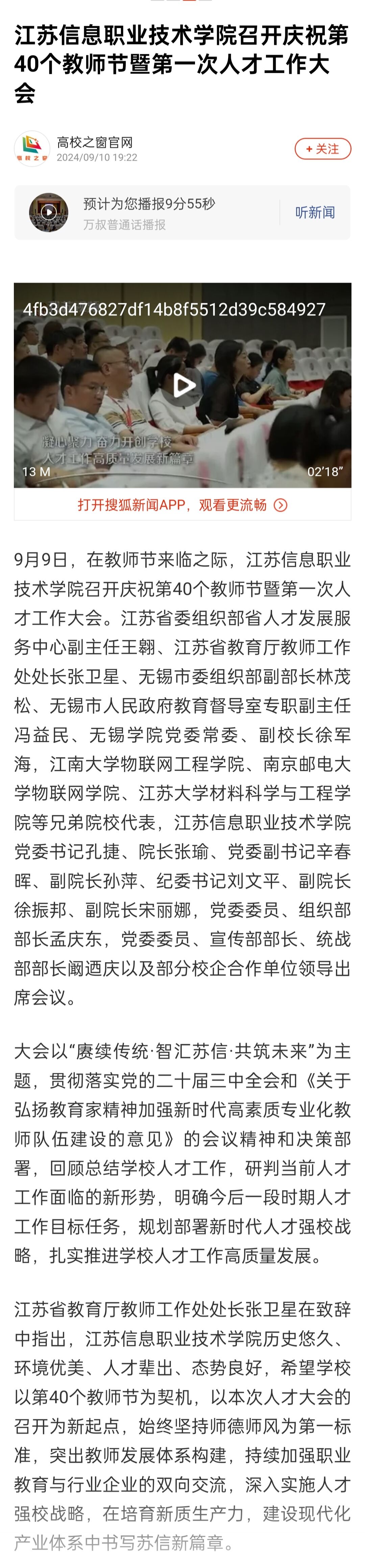 搜狐新闻:江苏信息职业技术学院召开庆祝第40个教师节暨第一次人才工作大会