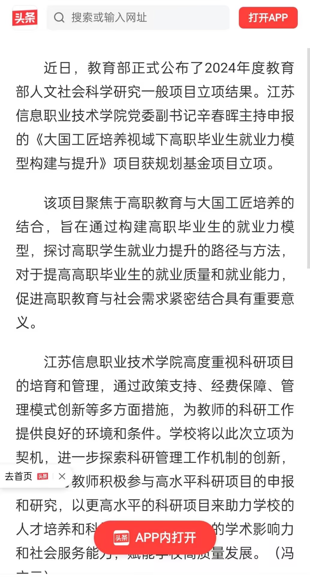 今日头条:江苏信息职业技术学院获批教育部人文社会科学研究规划基金项目