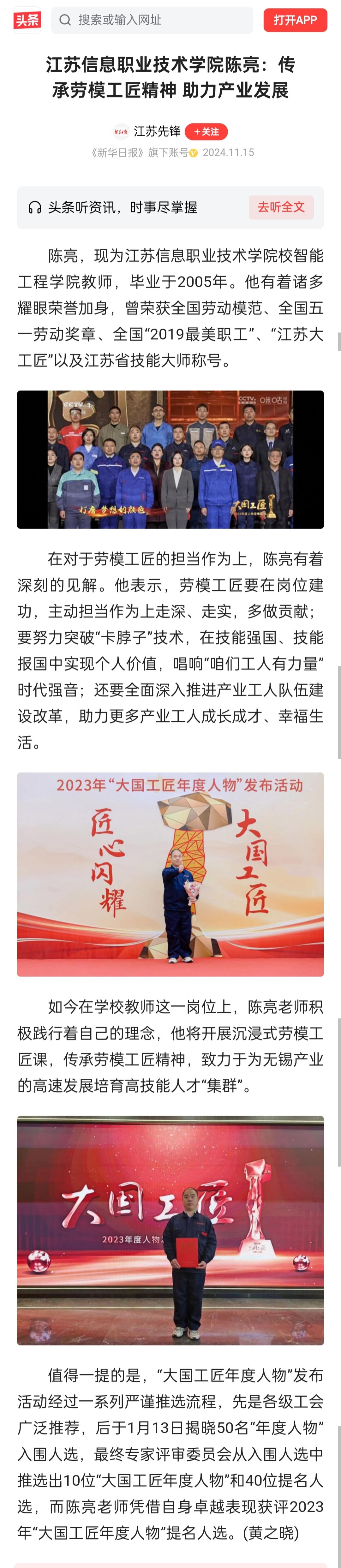 今日头条:江苏信息职业技术学院陈亮:传承劳模工匠精神 助力产业发展