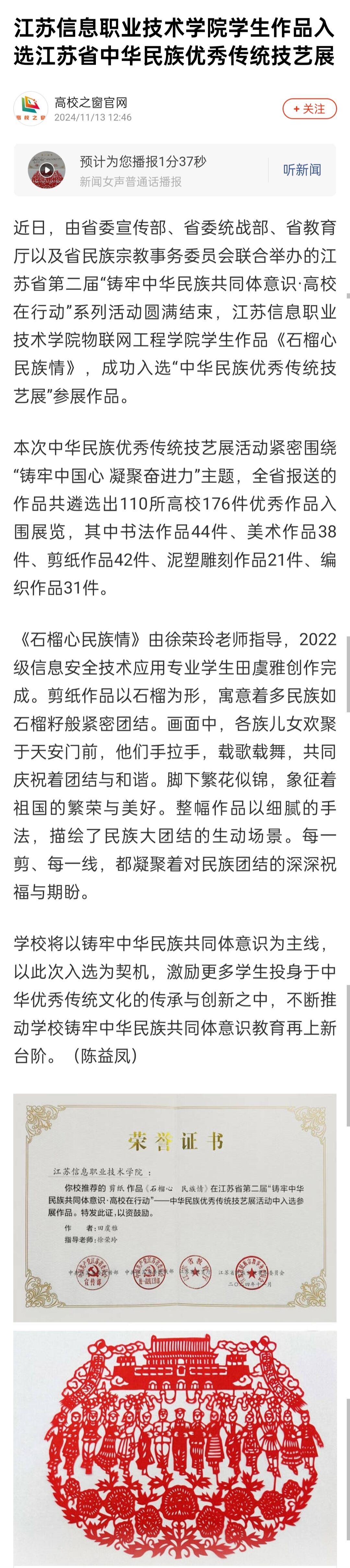 一点资讯:江苏信息职业技术学院学生作品入选江苏省中华民族优秀传统技艺展