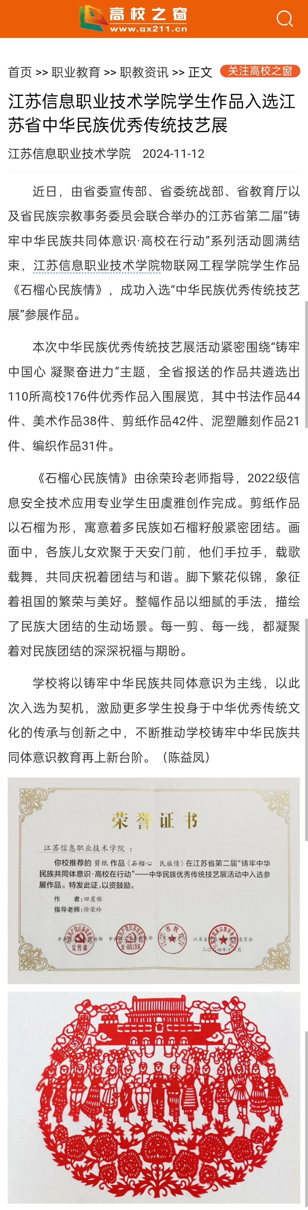 高校之窗:江苏信息职业技术学院学生作品入选江苏省中华民族优秀传统技艺展
