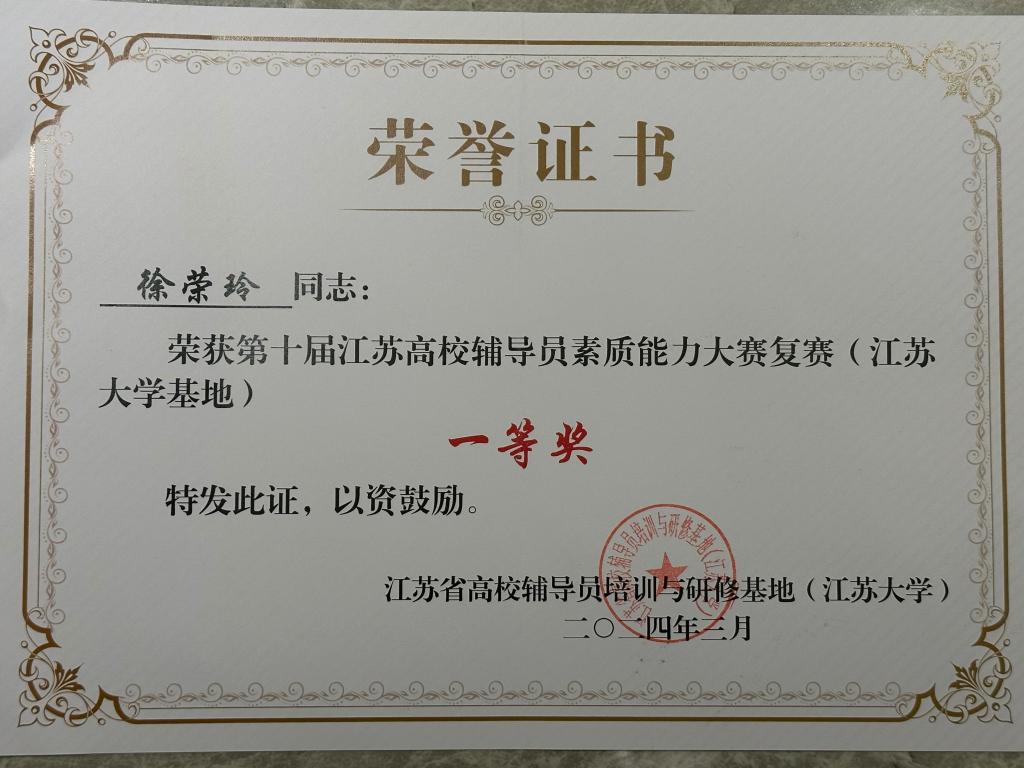 3月27日至28日,第十届江苏高校辅导员素质能力大赛江苏大学基地复赛在镇江举行,我校物联网工程学院辅导员徐荣玲老师荣获一等奖第一名。