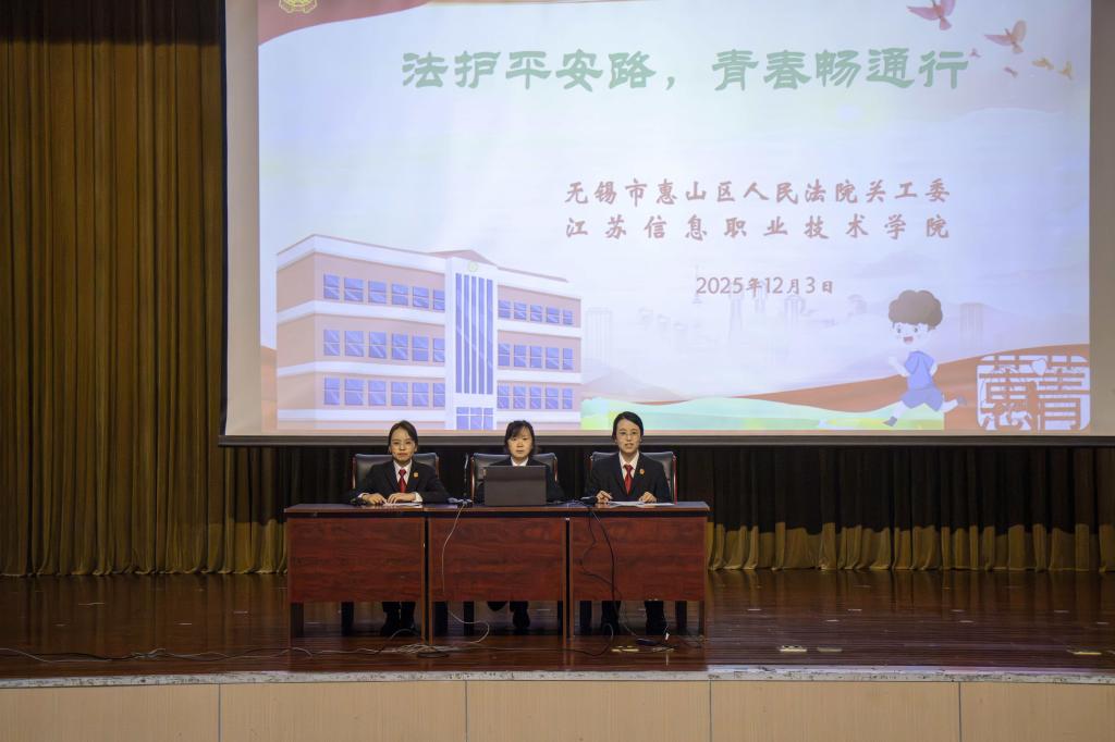 12月3日晚,无锡市惠山区人民法院关工委副主任边剑扬、韩龙、何炳良法官与阳山法庭荆佩、杨颖及王畅法官共同为在场学生分发法治宣传材料,提前引导学生了解法治知识。荆佩法官团队分两场开展《法护平安路平安畅通行》专题讲座,团队结合大学生网约出行、共享单车骑行等日常出行场景,解读交通事故责任划分与赔偿主体认定标准,同时通过典型案例,讲解事故后现场取证、责任申请、赔偿协商及法律救济等规范流程,强化学生法律意识与自我保护能力。