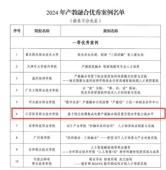 近日,工业和信息化部公布了2024年产教融合优秀案例,我校申报的《基于校企协调集成电路产教融合高质量引领办学能力高水平》案例荣获一等奖。