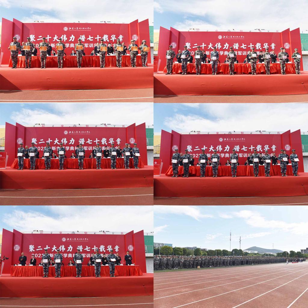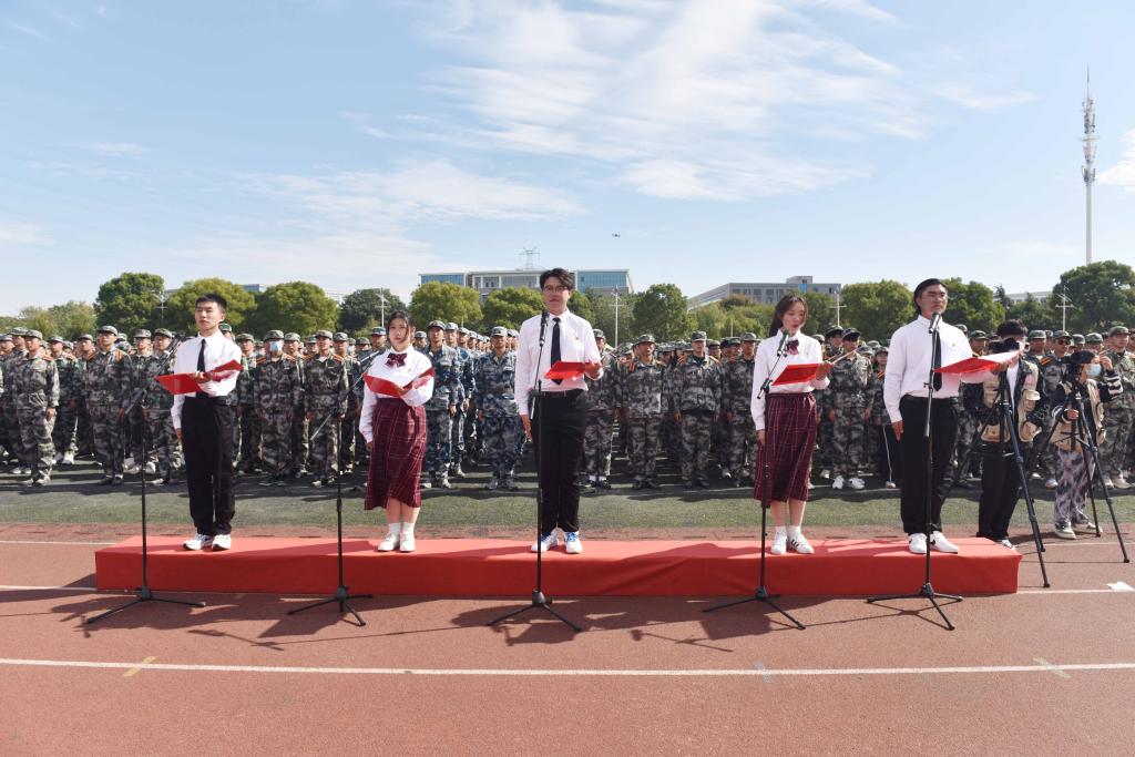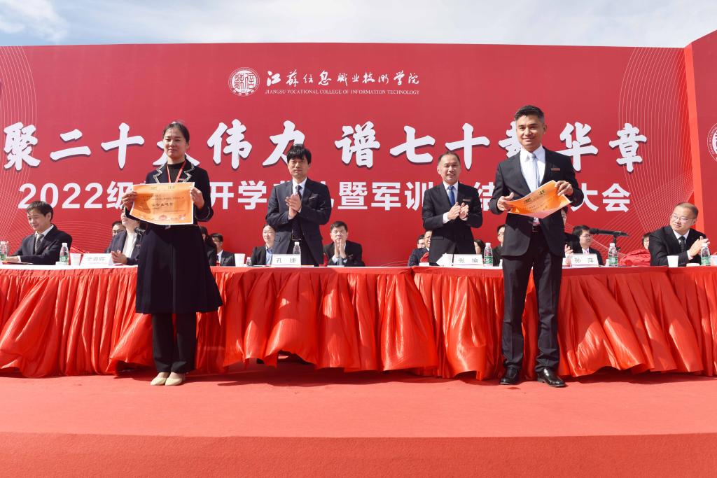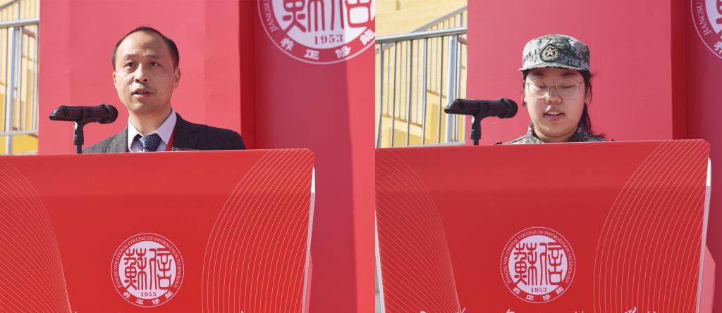 孙萍副院长宣读军训先进集体、个人表彰决定。学校党委书记孔捷、院长张瑜为先进营、先进集体代表、先进个人代表、优秀教官颁奖。
