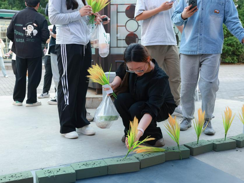 活动现场设置三大主题体验区,构建多维度教育场景。在春耕体验区,通过鲜花泥模拟稻田种植环境,设计限时30秒“插秧”挑战项目,让参与者直观感受粮食生产的艰辛过程;创意工坊区配备白色纸盘、马克笔及水果蔬菜模板,引导学生以艺术创作形式展现粮食主题,传递绿色环保理念;传统文化区推出“卡片识五谷”知识竞答与“‘稻’光箭影”投壶体验等特色环节,将传统游戏与粮食认知教育有机结合,强化对常见农作物的辨识能力。