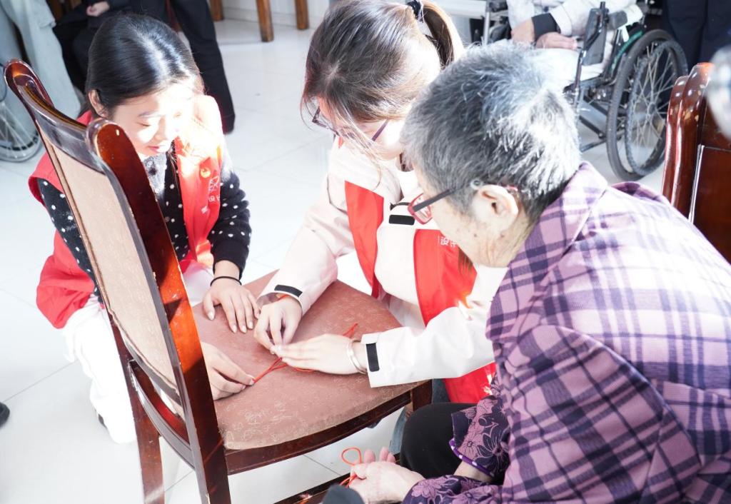 舞蹈表演暖场后,是非遗技艺活动展示。志愿者们手持红绳,挨个坐在老人身边,手把手地教他们编织中国结。穿绳、绕圈、打结每一步都细致讲解、耐心演示,将“平安顺遂”的心意揉进绳结。老人与志愿者们一边切磋手法,一边念叨着童年往事,现场其乐融融。