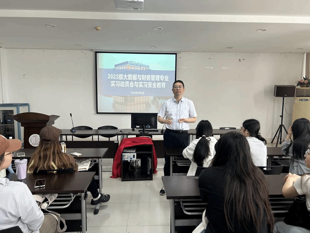 5 月 9 日,2023 级大数据与财务管理专业实习动员与安全教育会议在 S4-410 教室召开。商学院副院长吴铭峰出席会议。