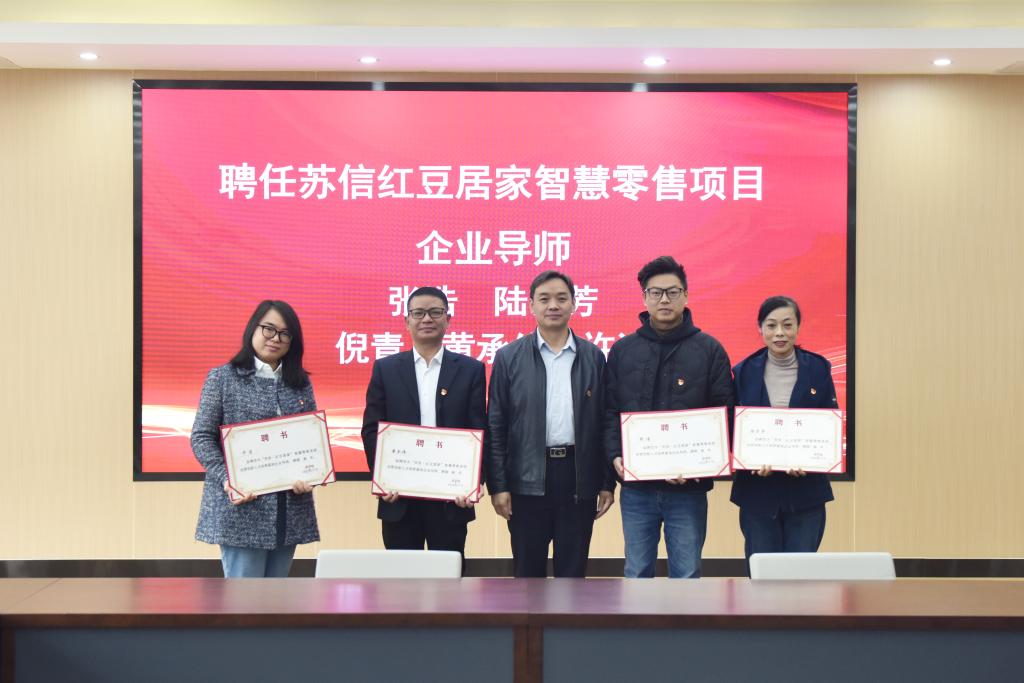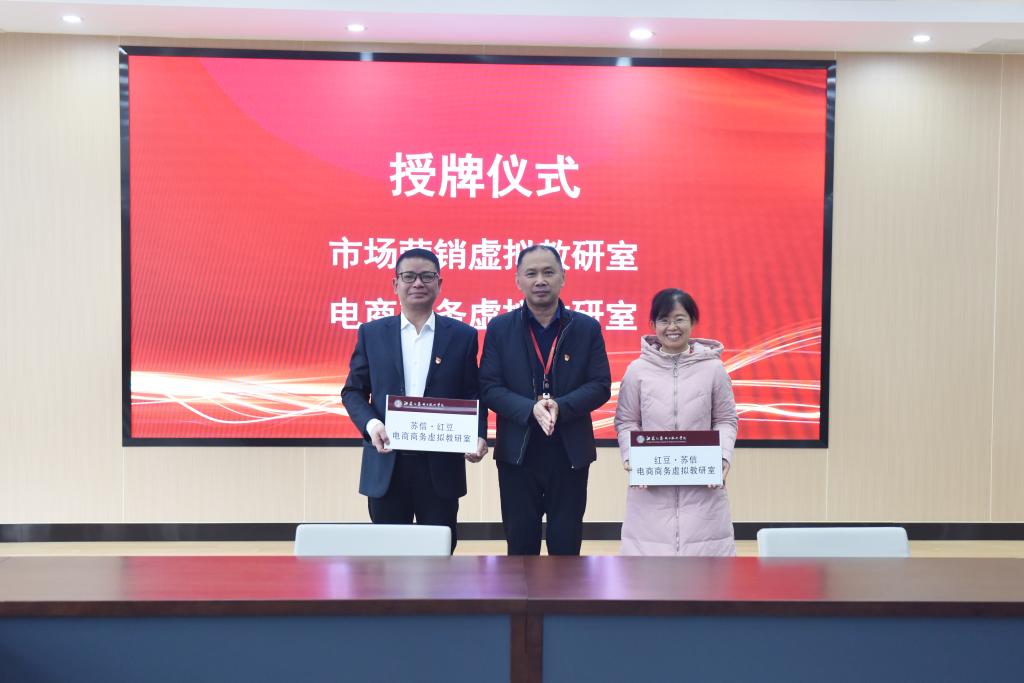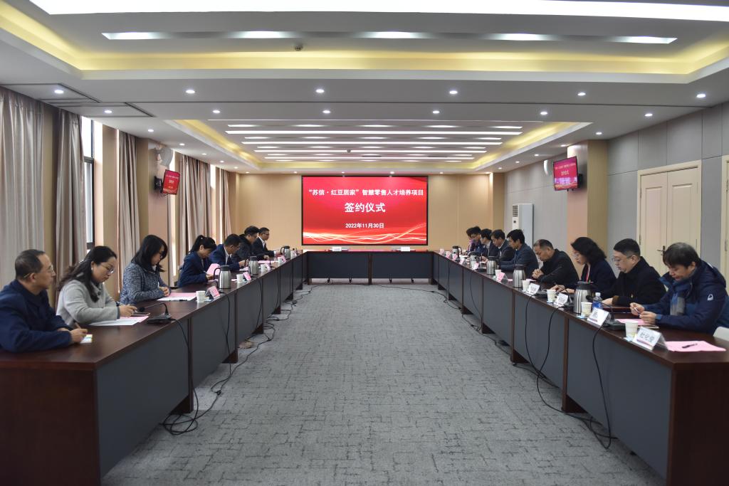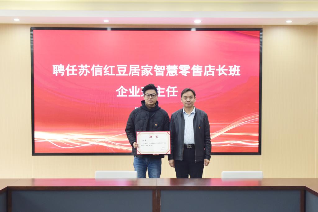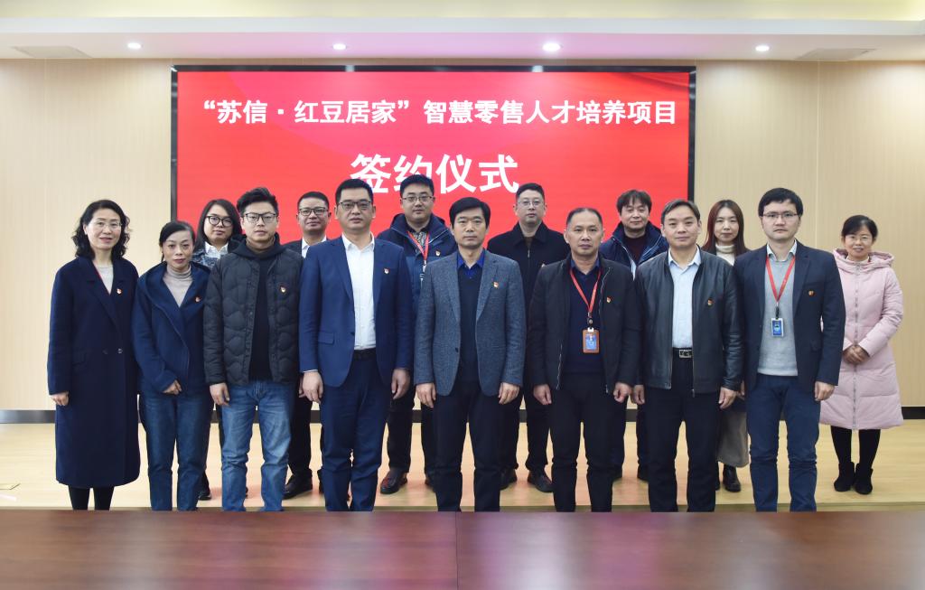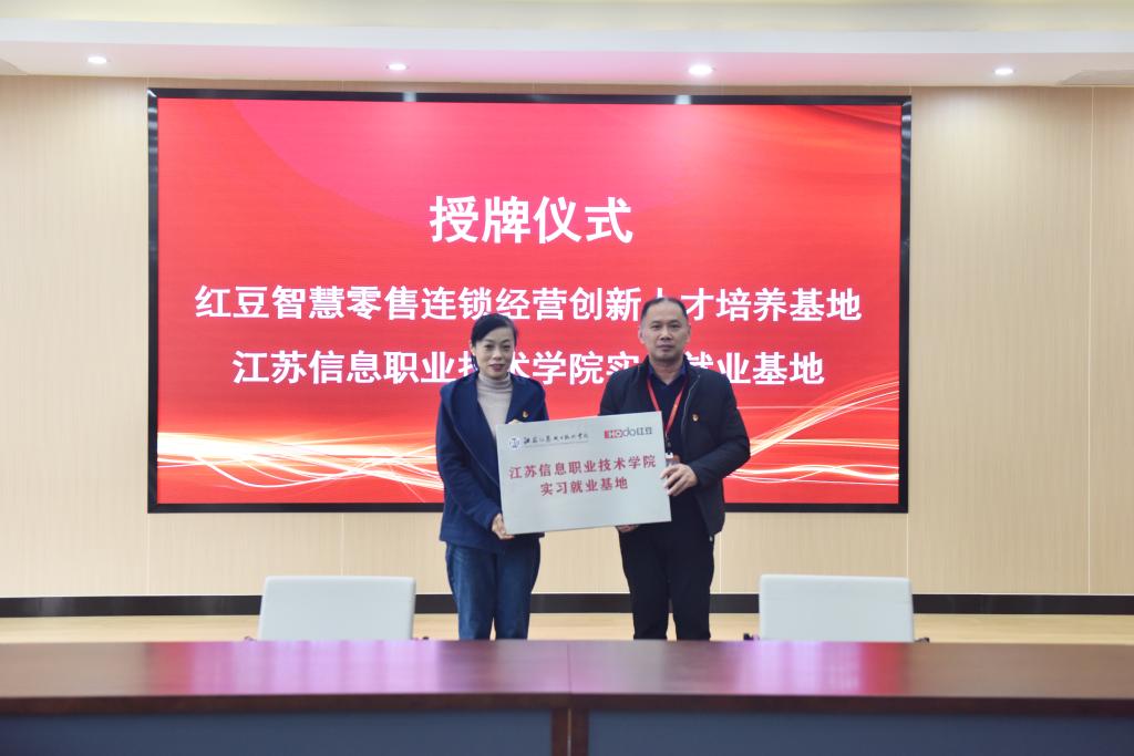 签约仪式上,周兵总经理和张瑜院长分别为“红豆智慧零售连锁经营创新人才培养基地”和“江苏信息职业技术学院实习就业基地”授牌。张瑜院长聘任周兵总经理为学校客座教授,张浩总监为红豆居家智慧零售店长班为企业班主任。成立了“苏信·红豆”虚拟教研室,张瑜院长为校企虚拟教研室授牌。