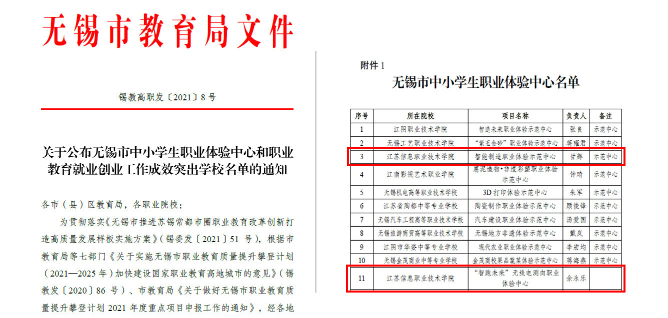 近日,经申报推荐、市级专家现场复核等环节,无锡市教育局发布了“关于公布无锡市中小学生职业体验中心和职业教育就业创业工作成效突出学校”名单的通知,我院“智能制造职业体验中心”获评“智能制造职业体验示范中心”,这是我院在职业教育方面取得的又一殊荣。