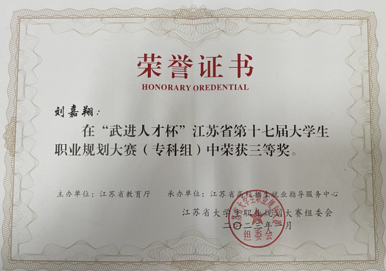 近日,江苏省教育厅下发《关于公布“武进人才杯”江苏省第十七届大学生职业规划大赛获奖名单的通知》,我院工业机器人211班刘嘉翔同学的参赛作品《扎根基层——做乡村振兴的领头雁》荣获专科生赛道三等奖。