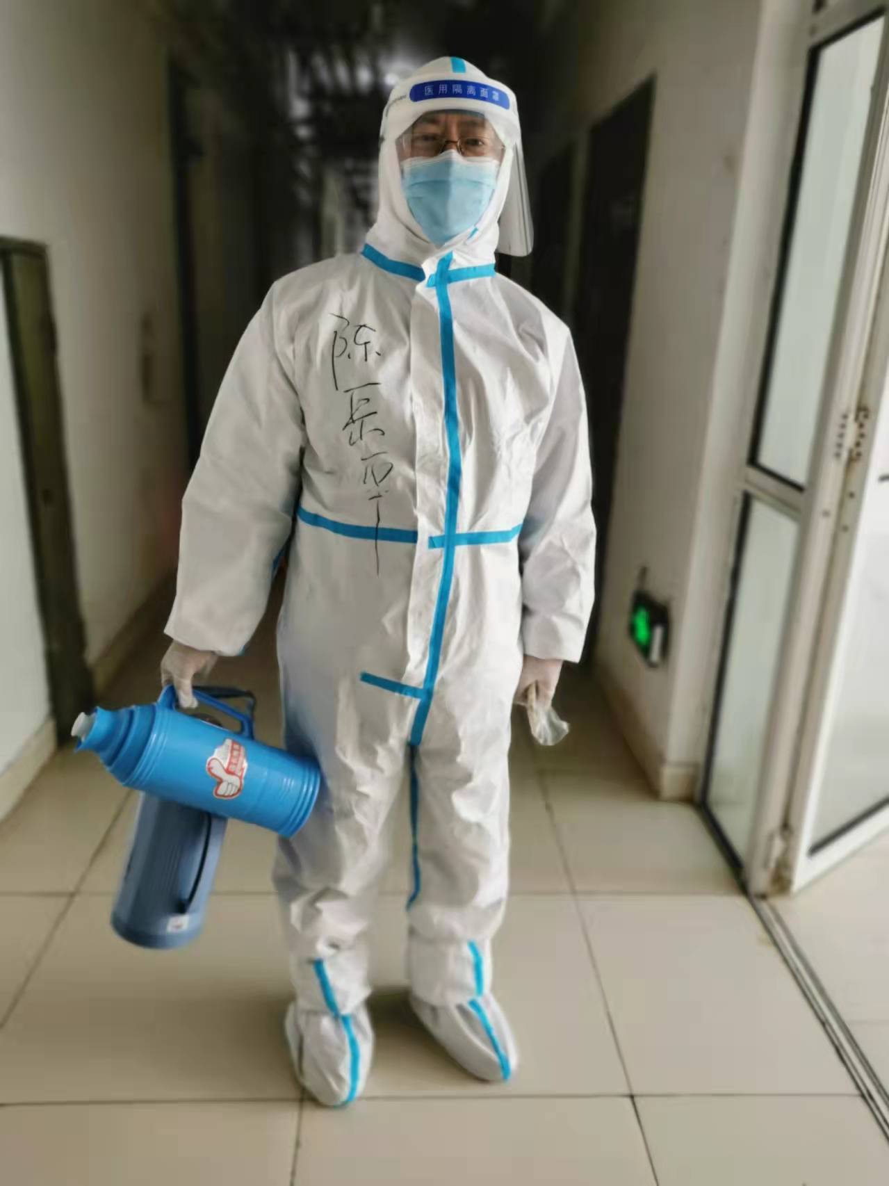 陈岳平:清晨六点,60后的陈岳平老师已经开始了一天的防疫工作,今天已经是他连续工作的第10天。30日晚收到学校紧急召集令后,已经58 岁的他没有迟疑,当即驾车30公里返回学校,全身心投入到疫情防控工作中。安全执勤、送餐送水、楼层消杀、垃圾清理,他和年轻辅导员一样冲在抗疫的第一线,谱写了抗击疫情、无私奉献的赞歌。